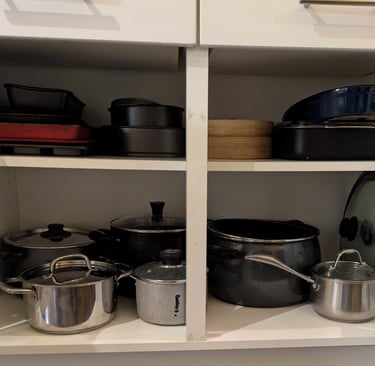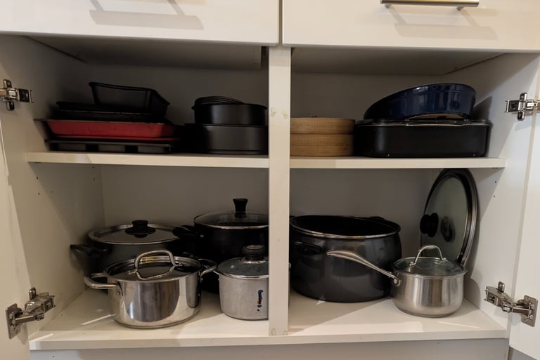 In Lara's case, the large double base cupboard made far more sense as a dedicated pots, pans, and baking tray cupboard, grouped by function, easy to access, nothing competing for space. That meant moving things out and finding better homes for them elsewhere, rather than trying to make a jumbled mix of items work in the same space.