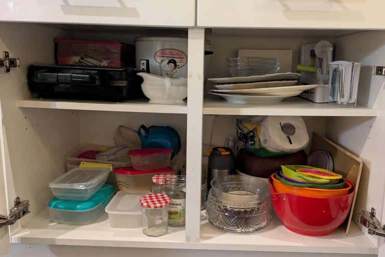 We emptied each section, made quick decisions about what was genuinely used and what wasn't, matched lids to containers (the orphan Tupperware lid is a universal kitchen problem), and rebuilt the storage with logic as the guide rather than habit.